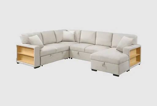 The Dimitri Beige Sectional with Right Chaise Pull-Out Bed and Hidden Storages Charging Ports is the perfect blend of style and functionality. Its casual design and neutral beige color make it a versatile addition to any living space. Crafted from 100% polyester fabric, this sectional is both durable and comfortable.
