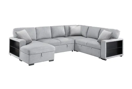 Dimitri Grey Boucle Fabric U-Shaped Sleeper Sectional with Left Chaise Pull-Out Bed, Hidden Storage & Charging Ports delivers flexible seating and a guest-ready bed in one casual piece. Upholstered in 100% polyester boucle, it rests on a pine and wood frame that supports everyday use while the left-facing chaise provides a roomy spot to stretch out. Integrated arm shelving includes USB and power outlets for device charging, and the chaise hides storage for blankets and pillows to help keep the living room tidy.