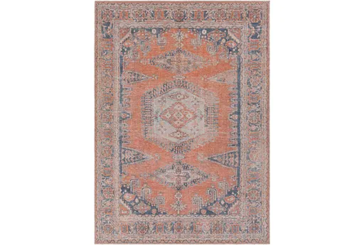 This beautiful 6'7"x9' rug in burnt orange and blue is both stylish and practical, as it is machine washable for easy maintenance. Its traditional design is perfect for any indoor space, and its durable fabric material ensures long-lasting use.