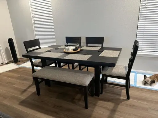 The Gunther Black Rectangular Wood 72" Dining Table with Bench and Chair Set for 6 adds a modern touch to your dining space. Featuring a sturdy and stylish design, this set is perfect for both casual family meals and elegant dinner parties. The charcoal finish complements the natural tones of the rubberwood, MDF, oak veneer, and fabric materials.