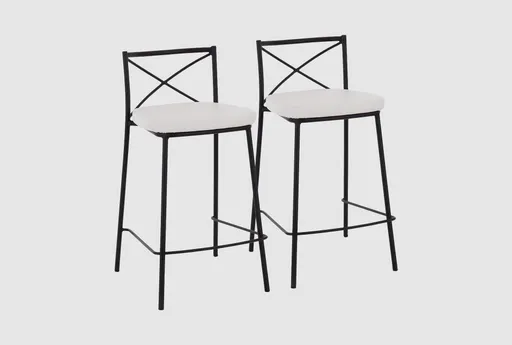 Introducing the Harlon 25" Black + White Metal Counter Faux Leather Stool Set Of 2. These modern stools feature a sleek X-back design and are armless, making them perfect for any dining room or kitchen. The combination of black metal and white faux leather adds a sophisticated touch to your space.