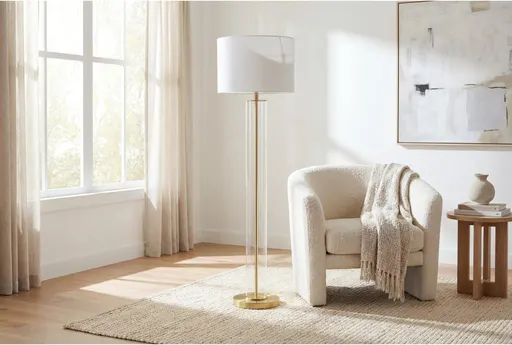 This modern floor lamp features a brushed brass finish and a clear glass cylinder base, topped with a fabric shade for a sleek and stylish look. The lamp is crafted from metal and glass, making it a durable and attractive addition to any room. The lamp has a height of 58 inches, making it a great choice for larger rooms or spaces. The clear glass cylinder base adds a touch of elegance and allows the lamp to blend seamlessly with any decor. The brushed brass finish gives the lamp a sophisticated look, while the fabric shade provides a warm and inviting glow.