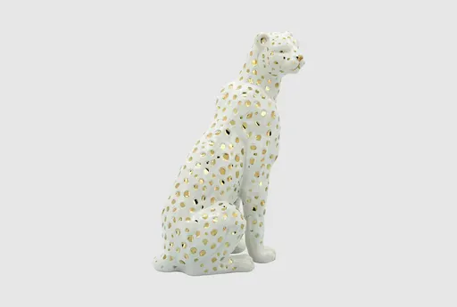 Enhance your decor with the 11 Inch Natural White + Gold Ceramic Sitting Leopard. This modern curio piece is designed to bring a touch of sophistication to any space with its neutral, soft color palette and striking gold accents. Crafted from ceramic for durability and style. Features intricate gold detailing that catches the eye. Perfect as an accent object in maximalist decor.