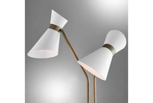 Illuminate your space with the 60 Inch White + Brass Metal Angular 2-Lite 2-Arm Shade Task Floor Lamp. This modern floor lamp features a sleek antique brass and white finish, making it a stylish addition to any room. Its dual conical shades provide ample lighting, perfect for your office, workspace, or common areas.