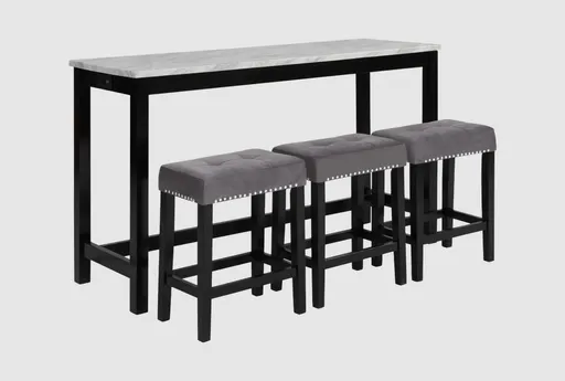Enhance your living space with the Janie Grey Black Wood 4 Piece Console Bar Set. Designed with a contemporary style, this bar set features a sleek grey color that complements any decor. The solid rubberwood construction ensures durability, while the faux marble tabletop adds a touch of sophistication.