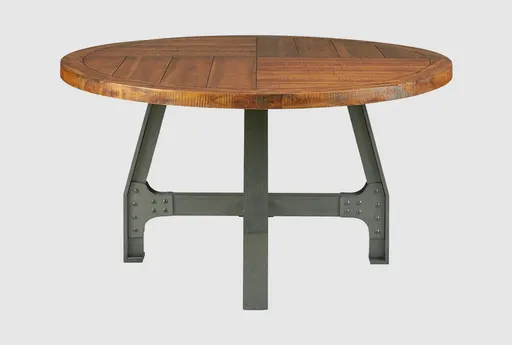 Enhance your dining experience with the 54" Lainne Brown Wood Round Dining Table. Combining rustic charm and modern design, this table is the perfect centerpiece for your dining room or kitchen. Crafted with a sturdy metal base and a warm amber and graphite finish, it provides both durability and style for everyday use.