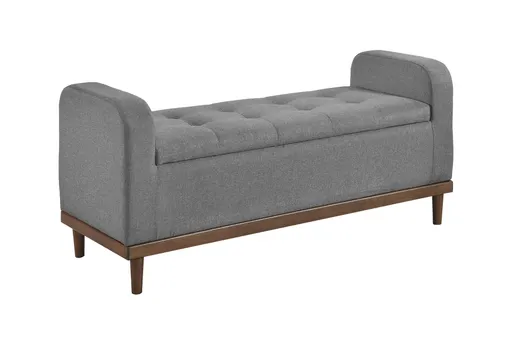This 50" Modern Light Grey Wood Rail Bedroom Storage Bench is the perfect addition to your bedroom or entryway. Upholstered in soft, grey fabric, it offers both comfort and practicality. The built-in storage makes it ideal for organizing shoes, blankets, or other essentials.
