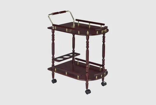 Enhance your entertaining space with the Modern 2-Tier Merlot And Brass Bar Cart With Wheels. This stylish bar cart features a rich merlot wood finish and elegant brass accents, making it a sophisticated addition to any modern or contemporary setting. With two tiers of shelving and convenient guardrails, this cart is perfect for serving drinks and snacks with ease.