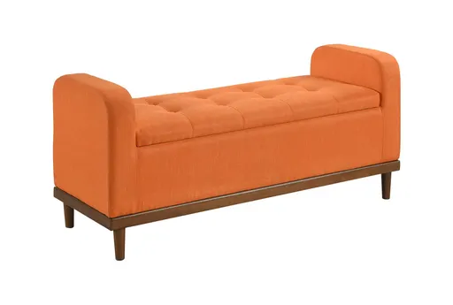Enhance your bedroom with the vibrant and functional 42" Modern Orange Wood Rail Bedroom Storage Bench. This stylish bench combines modern design with mid-century modern elements, making it a perfect addition to any contemporary space. The bold orange fabric upholstery adds a pop of color, while the solid wood and plywood frame ensures durability and stability.