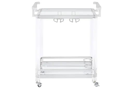 Enhance your entertaining space with the Modern 2-Tier Glass Clear Bar Cart With Wheels. This sleek and stylish bar cart features a contemporary design with clear tempered glass and a chrome metal finish, making it a perfect addition to any modern home. The clear acrylic material adds a touch of elegance, while the wheels provide easy mobility for serving guests.