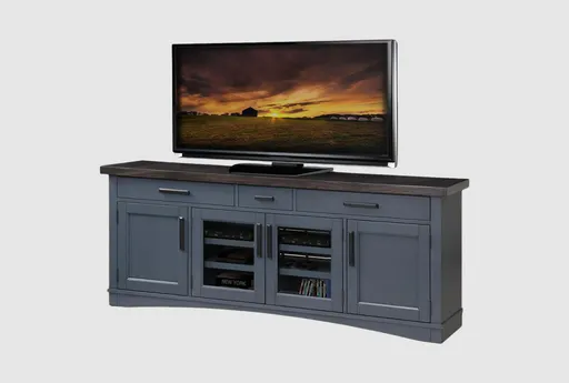 The Nantucket Navy Blue Modern 76" Glass TV Stand with Doors is the perfect addition to your living room. Crafted with poplar solids and birch veneers, it features a stunning oak veneer top that adds a touch of sophistication to your space. This entertainment center combines style and functionality with its adjustable shelves, cord management, and ample storage options.