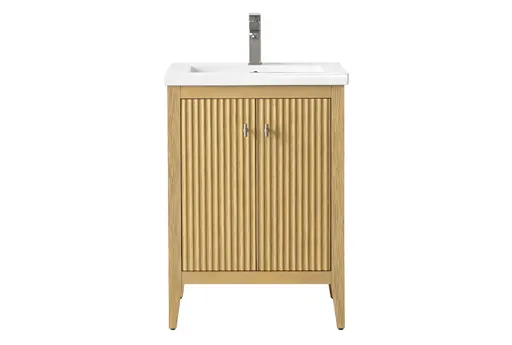 The 24" Natural Single Sink 2 Door Bath Vanity Cabinet With Ceramic Top & Silver Nickle Hardware is a compact modern vanity that fits small bathrooms while providing a full ceramic sink surface for easy cleaning. The frame combines solid and manufactured wood with poplar details, and the two doors open to reveal generous storage for towels and toiletries. A natural finish and silver nickle hardware keep the look warm and the functions simple so you can focus on daily routines.