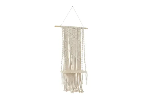Maintain an organized home to create comfort and a welcoming atmosphere. Utilize your wall space to add more storage for a space saving solution in any compact area. Give your wall a charming appeal with this macrame inspired shelf and display your precious crystals and small LED candles. This item ships in 1 carton. Cotton wall shelf makes a great gift for any occasion. Due to the handmade nature of this item, no two will be alike, there will be slight differences in shape, size, and color. Can be hung horizontally using the cotton cord; nails and screws not included. Suitable for indoor use only. This item ships fully assembled in one piece. Maximum weight limit is 20 lbs. Made in India. This is a single white colored floating shelf. Cotton wall shelf features a single shelf. Bohemian style.