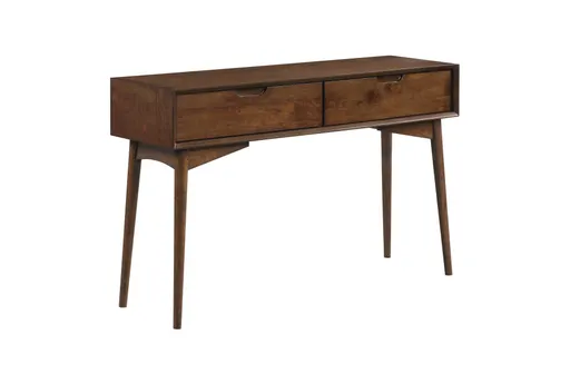 The Nelson 48" Walnut Brown Entryway Console Table with Storage Drawers combines modern design with mid-century charm. Crafted from MDF and rubberwood, this console table features a rich walnut finish that adds warmth to any entryway or hallway. Its two large drawers with full extension glides provide ample storage space, while the tapered legs enhance its stylish appeal.
