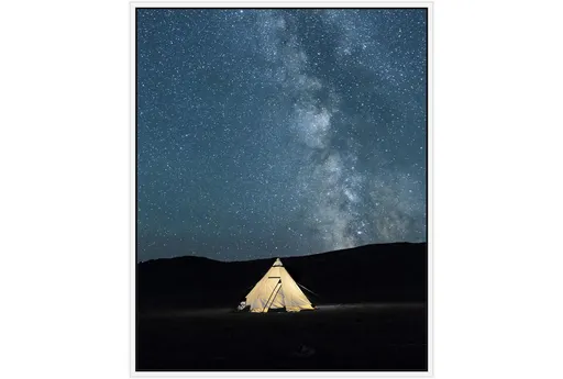 Experience the serene beauty of remote accommodations under a night sky with this stunning framed art piece. The vertical orientation and rustic style make it a perfect addition to any room, capturing the essence of natural scenery in a large, rectangular format. Made in the USA, this fine art photography is sure to be a captivating focal point in your home.