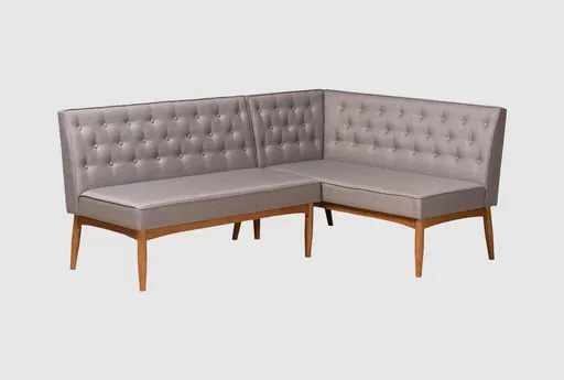 The Riordan Mid-Century Modern Grey Fabric Upholstered and Walnut Brown Wood 2-Piece Dining Nook Banquette is a stylish addition to any dining room. This banquette features tufted detailing and a high back, providing both comfort and a touch of sophistication to your space. The grey fabric and walnut brown wood combine to create a modern look that complements a variety of interior styles.