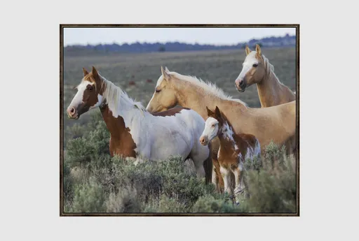 Bring the beauty of nature into your living room with the 52X42 Roam Free With Espresso Frame. This rustic framed canvas art features a stunning landscape scene with animals in their natural habitat. The calming hues of brown, tan, white, and green will add warmth and charm to any space.