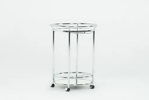 The 29.5" Roe Silver Metal Kitchen Bar Cart is a stylish and functional addition to any modern kitchen or casual dining space. Its sleek chrome finish and metal frame provide a contemporary look, while the two mirror shelves offer ample storage and display options. This bar cart also features three bottle holders and wine glass inserts, making it perfect for entertaining guests.