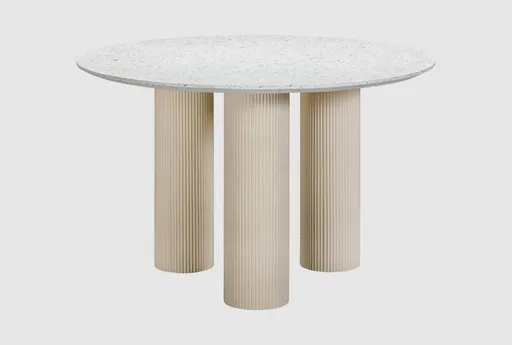 Introducing the 47" Round Brown White Concrete Terrazzo Top Indoor/Outdoor Dining Table with Pedestal. This modern dining table features a stunning terrazzo top that adds a touch of contemporary style to any space. Crafted from durable concrete, it is designed to withstand various weather conditions, making it perfect for both indoor and outdoor use.