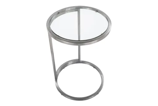 This 24" Round Silver C-Table features a clear tempered glass top, offering a sleek, modern aesthetic. The sturdy metal frame, painted in stainless steel, complements the clear glass, creating a contemporary look. This design also serves as the perfect bedside table.