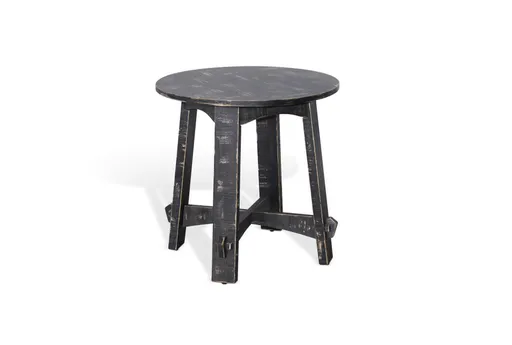 Enhance your living room with the 24" Rustic Distressed Black Wood Round End Table. This small, round table features a beautiful black sand finish that adds a touch of rustic charm to any space. Made from solid wood and MDF, it offers durability and a timeless appeal.
