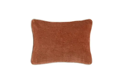 Add a touch of rustic charm to your living room with this 12X16 Terra Cotta Orange Stonewashed Velvet Lumbar Throw Pillow made of 100% cotton velvet. The pillow features a hidden YKK zipper and 1/8" piping in 185 natural, and is dyed and stonewashed for a unique look.