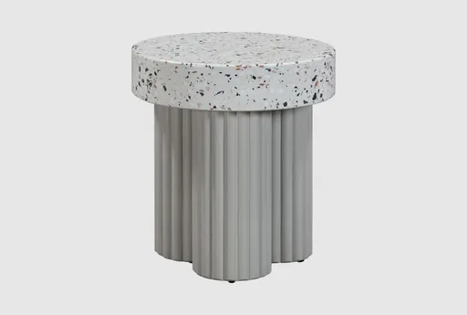 Enhance your outdoor or living room space with the 18" White Terrazzo Fluted Outdoor Side Table. This modern round side table features a unique terrazzo finish, making it a striking addition to your decor. Its weather-resistant concrete material ensures durability and longevity.