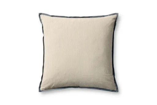 22'' X 22'' Sullivan Natural & Blue Stripe Flange Square Cotton Accent Pillow With Down Insert By Jeremiah Brent x Loloi is a 22 by 22 inch square accent pillow that pairs a soft beige, machine-woven cotton cover with a blue stripe flange for a fresh, modern look. It includes a down insert for plush, supportive comfort and a flange edge that keeps the silhouette neat on sofas, beds, and accent chairs. A high performance fabric backing and cotton-polyester components make care simple—follow the included care instructions for machine washability and everyday durability.