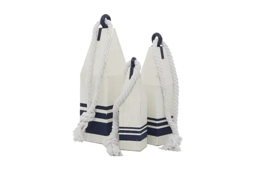 Inspired by the blissful serenity and allure of the sea, this set of 3 handmade white wood buoy sculptures brings soothing hues and natural textures to your home. Each piece is hand-carved from solid fir wood and features white jute rope and iron accents. The decorative statues showcase white with navy blue stripes, a white rope, and a distressed finish, adding effortless charm to any space.