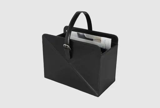 The leather magazine holder boasts detailed stitching and curved buckle handles, offering both style and functionality.
