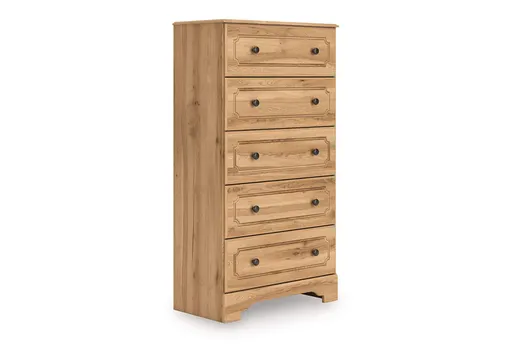 Country rustic. Vintage inspired. However you see it, you’re sure to be charmed by this chest of drawers. Adorned with chic drawer knobs and a warm oak grain finish, it offers a relaxed mix of picturesque aesthetics. Its storage space gracefully welcomes clothes, linens and other bedroom necessities. With an air of easygoing elegance, this dresser lets you drift away to a simpler time and place.