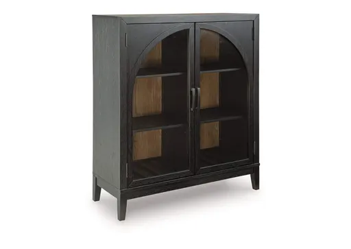 If your love of entertaining is only surpassed by your love of sleek, versatile style, the Armenleigh bar cabinet expertly suits your needs. Racks for wine bottles and glasses neatly store necessities for a pour of vino. Adjustable shelves comfortably hold additional bottles, dishware or drink-making accessories. For added flexibility, the cabinet's black and natural brown finishes effortlessly pair with your home’s existing aesthetic. Doors with softly curved glass inserts allow this chic piece to double as a display space.