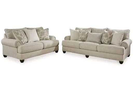 The Asanti sofa and loveseat package has an alluring look that's guaranteed to turn heads. Richly textured fabric in a light, easygoing hue is enhanced by even lighter flax peeking through. Distinctive roll arms add a dab of debonair, while indulgently plush cushions cradle you softly. Sit back and relax in comfort and style, with plenty of room to stretch out and unwind at the end of a long day.
