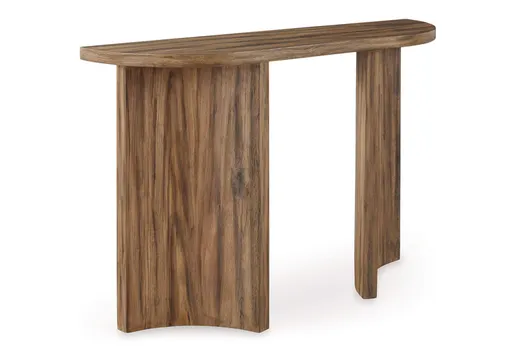 Showcasing an elevated, artistic silhouette, the Austanny sofa table expertly blends modern form and function. Its warm brown finish highlights the stunning wood grain, bringing an earthy element to staging a sofa-side lamp or other decor. Complete with a thick, substantial top, it’s a naturally beautiful living room staple in the making.