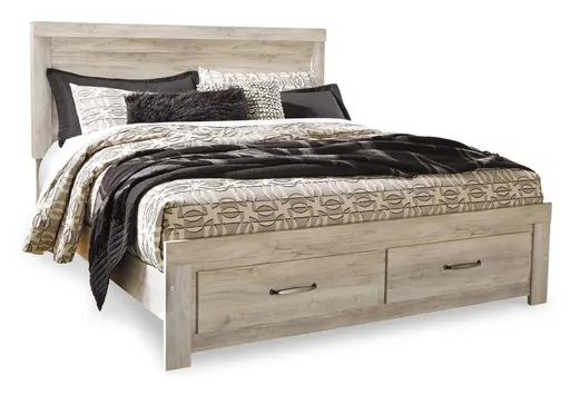 It’s gorgeous; it’s modern farmhouse; it’s the Bellaby king storage bed. Wispy, whitewash finish infuses so much character without covering the grain for that weathered, rustic look you crave. Clean-lined, classic panel styling and a pair of drawers at the foot of the bed provide a countrified-chic bedroom retreat that’s a breath of fresh air. Mattress available, sold separately.