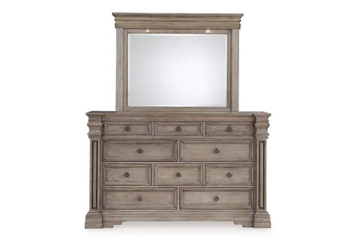 Discover something exceptional in the Blairhurst dresser with mirror. Its impressive silhouette offers a casual traditional aesthetic, embodied by classic-inspired profiles and a relaxed grayish brown finish. Inset framed drawers of various sizes are casually cool and packed with ample storage possibilities. The mirror frame features mini LED lights that handsomely reflect your sense of informal yet timeless style.