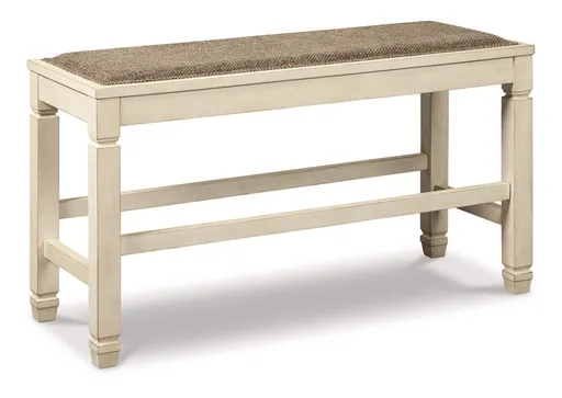 The beauty of the Bolanburg upholstered dining bench is something to savor. Serving up comfort and flair, this generously scaled counter-height bench entices with a cushioned seat covered in a heavy woven fabric that complements the antiqued white finish.
