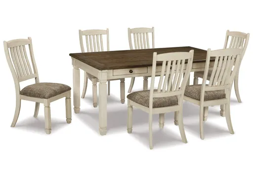 Enjoy beautiful cottage style with the classic Bolanburg dining table set. With a rustic planked top, this table serves up casual with a vintage twist. The gently distressed tabletop, paired with the rake-back design of the chairs in a textured antique white finish, is a perfect set for impromptu gatherings. With six built-in drawers, you can keep placemats, napkins and utensils on hand for maximum practicality in any living space. For a quaint ensemble you're bound to love, choose this Bolanburg set.