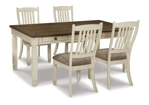 Enjoy beautiful cottage style with the Bolanburg dining room table set. With a rustic planked top and six convenient drawers, this table is classic farmhouse with a twist. The gently distressed tabletop serves up a vintage look with ease. No need to head to the linen closet for extra place settings. Keep placemats, napkins and utensils on hand in the table's built-in drawers. Four rake-back chairs with sumptuously upholstered seats make it easy to linger longer.