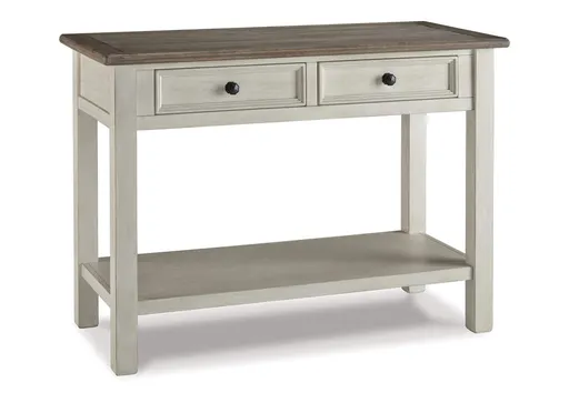 Store and showcase your favorite things with the Bolanburg sofa table. Its textured antique white finish creates a vintage two-tone look that will endure for years.