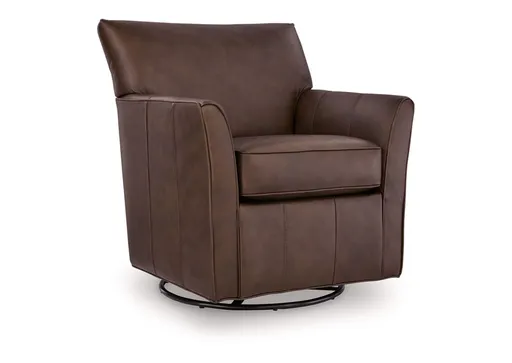 Settle into the buttery softness of the Braydunn accent chair. Upholstered in a combination of rich espresso brown leather and skillfully matched faux leather, its surface is incredibly smooth to the touch, inviting you to sink in and relax. With a gentle glide and effortless swivel, this piece isn't just for sitting—it's for unwinding.