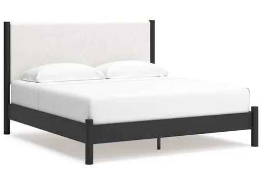 The Cadmori king upholstered panel bed reflects your sophisticated approach to boho style. Crafted with both form and function in mind, its fresh white fabric beautifully contrasts the matte black finish. The versatile design suits all-neutral spaces or blends with your favorite pops of color. It’s inviting, yet posh. Luxe, yet laid-back. With this bed, your free-spirited vibe meets modern design.