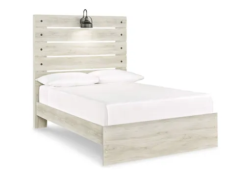 What a delightful take on rustic industrial style. Whether modern loft or modern farmhouse, the Cambeck full panel bed makes itself at home. The wispy whitewash palette enhances without covering the grain for that weathered look you crave. Love to read in bed? You’re sure to find the retro-chic light sconce and USB plug-ins on the open-slat style headboard such a bright idea.