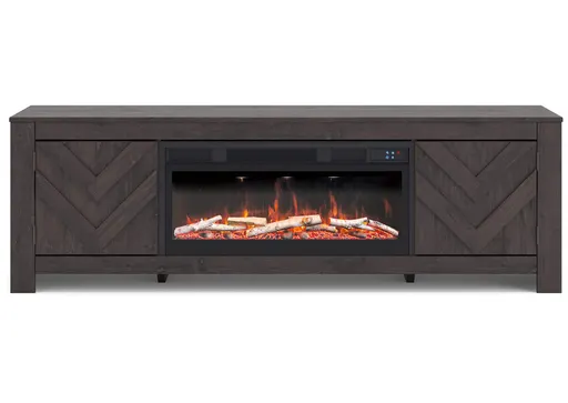 The Cayboni TV stand with electric fireplace embraces a classically charming aesthetic and repurposes it for modern living. Its dark charcoal finish appeals to your love of vintage character, while a chic chevron pattern is effortlessly on trend. Media accessories stay tucked away in style thanks to hidden storage behind the doors. And for added ambiance, the electric fireplace brings a cozy-cool vibe to your living room. With the touch of a button, activate the LED-lit flame and adjust the temperature or the flame brightness. The flame effect includes multiple color options and a realistic-looking faux birch log set.