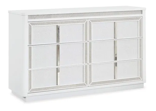 Transform your bedroom with the Chalanna dresser. Its modern design and glamorous details create a sophisticated retreat. The built-in LED lighting and rhinestone-framed drawers add style and practical storage. Let your sanctuary shine—and never let anyone dull your sparkle.