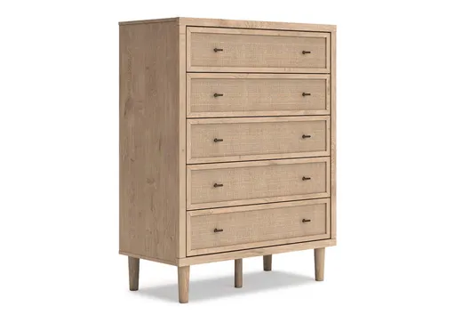 Clean-lined and contemporary—but far from stark—the Cielden chest of drawers is a fresh style awakening. Pairing a light finish with replicated oak grain and textured beige details that replicate the look of cane, its mixed materials bring a naturally versatile vibe to your bedroom. Sleek, simple hardware plays perfectly with the modern aesthetic. Prepare to have your mind blown by the vast universe of possibilities that await within the spacious drawers.