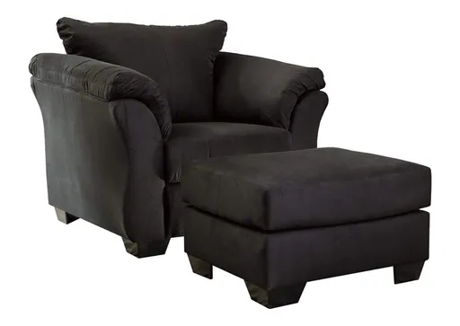 Talk about fine lines and great curves—that’s the beauty of the Darcy chair and ottoman. Made to suit your appreciation for clean, contemporary style, this fashion statement is complete with a striking flared frame, comfy pillow top armrests, tapered feet on the ottoman and an ultra-soft upholstery that holds up to everyday living.