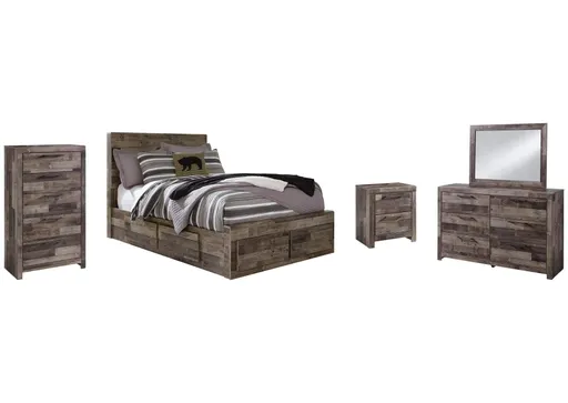 Walk the line between industrial and farmhouse styles with the modern heft of the Derekson panel storage bed, nightstand, chest of drawers and dresser with mirror. A rustic butcher block finish is tastefully roughhewn with appealing color variations and imperfections. Integrated storage in this substantial bed provides ample space for belongings while the nightstand, chest and dresser showcase roomy drawers with metal pulls in an antiqued gunmetal finish to complete this eclectic look.