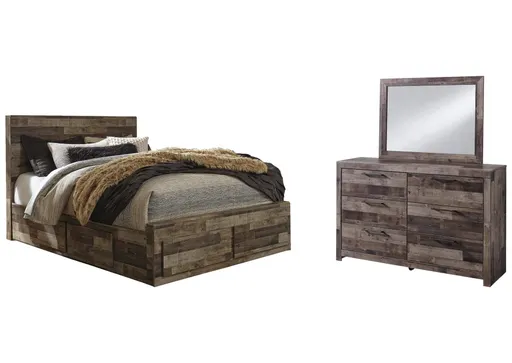 Walk the line between industrial and farmhouse styles with the modern heft of the Derekson panel storage bed and dresser with mirror. A rustic butcher block finish is tastefully roughhewn with appealing color variations and imperfections. Integrated storage in this substantial bed provides ample space for belongings while the dresser showcases roomy drawers with metal pulls in an antiqued gunmetal finish to complete this eclectic look.