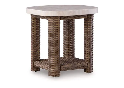 Get back to nature with the relaxed styling of this outdoor end table. Crafted with a sturdy aluminum frame and resin wicker, it offers exceptional durability and style. A smooth tabletop with softly rounded edges holds nibbles, sips and more. And don't forget the handy lower shelf. Sounds like fabulous form and function to us.